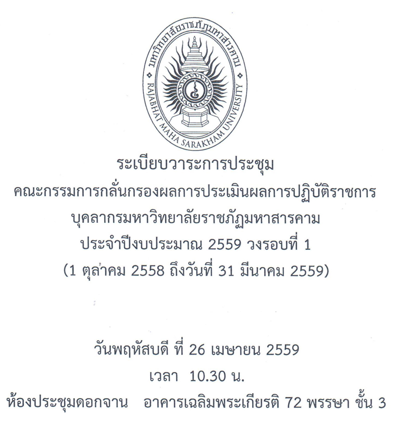 รศ.สมชาย วงศ์เกษม อธิการบดี เป็นประธานการประชุมคณะกรรมการกลั่นกรองผลการประเมินผลการปฏิบัติราชการบุคลากรมหาวิทยาลัยราชภัฏมหาสารคาม ประจำปีงบประมาณ 2559 วงรอบที่ 1 ( 1 ตุลาคม 2558 ถึงวันที่ 31 มีนาคม 2559 ) พร้อมด้วย ผอ.ลำดวน ดวงคมทา ผู้อำนวยการกองบริหารงานบุคคล และผู้บริหารทุกหน่วยงานในมหาวิทยาลัยราชภัฏมหาสารคาม เป็นกรรมการเพื่อพิจารณากลั่นกรองผลการประเมินการปฏิบัติราชการของบุคลาการ ในวันที่ 26 เมษายน 2559 เวลา 10.30 น. ณ ห้องประชุมดอกจาน อาคารเฉลิมพระเกียรติ 72 พรรษา