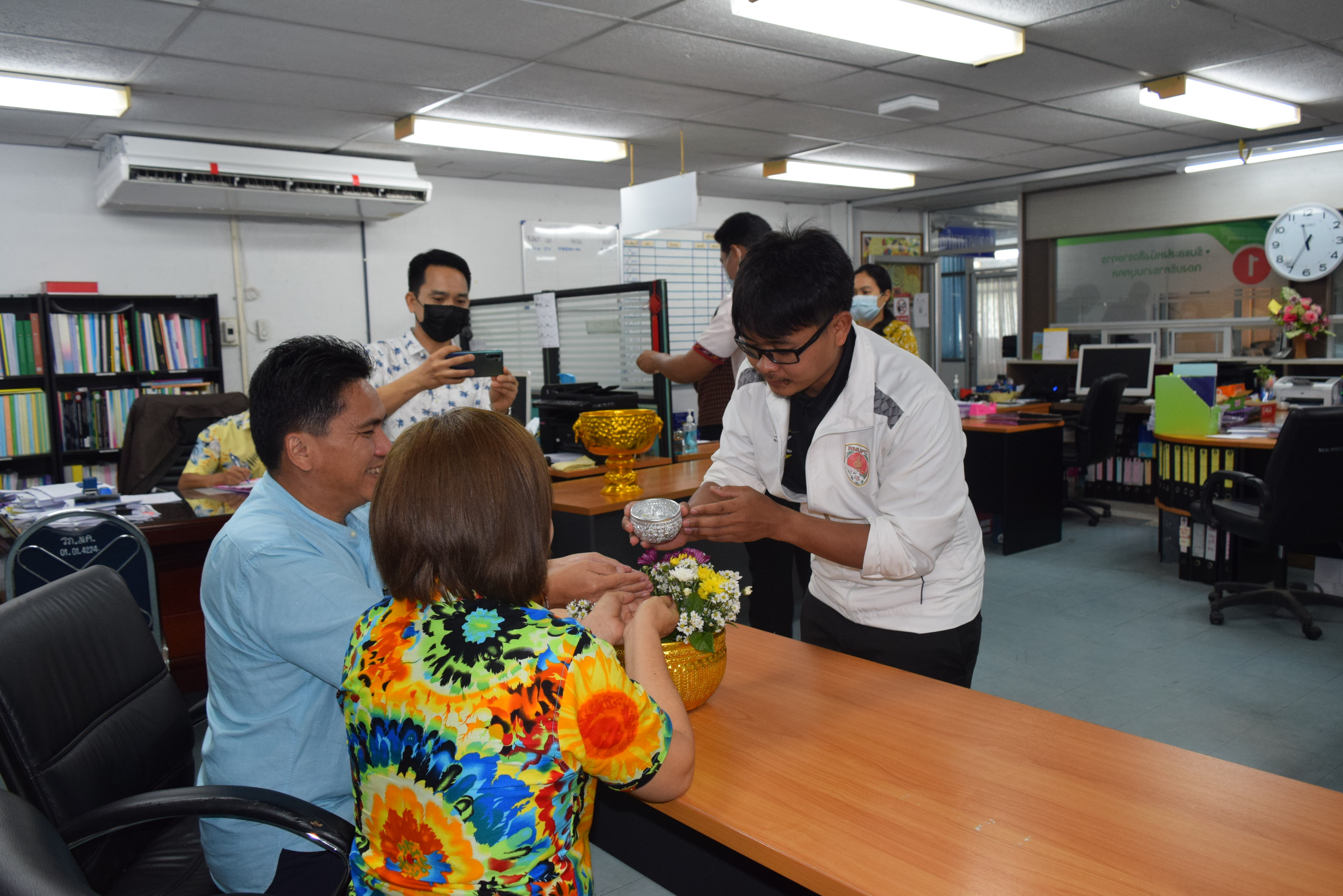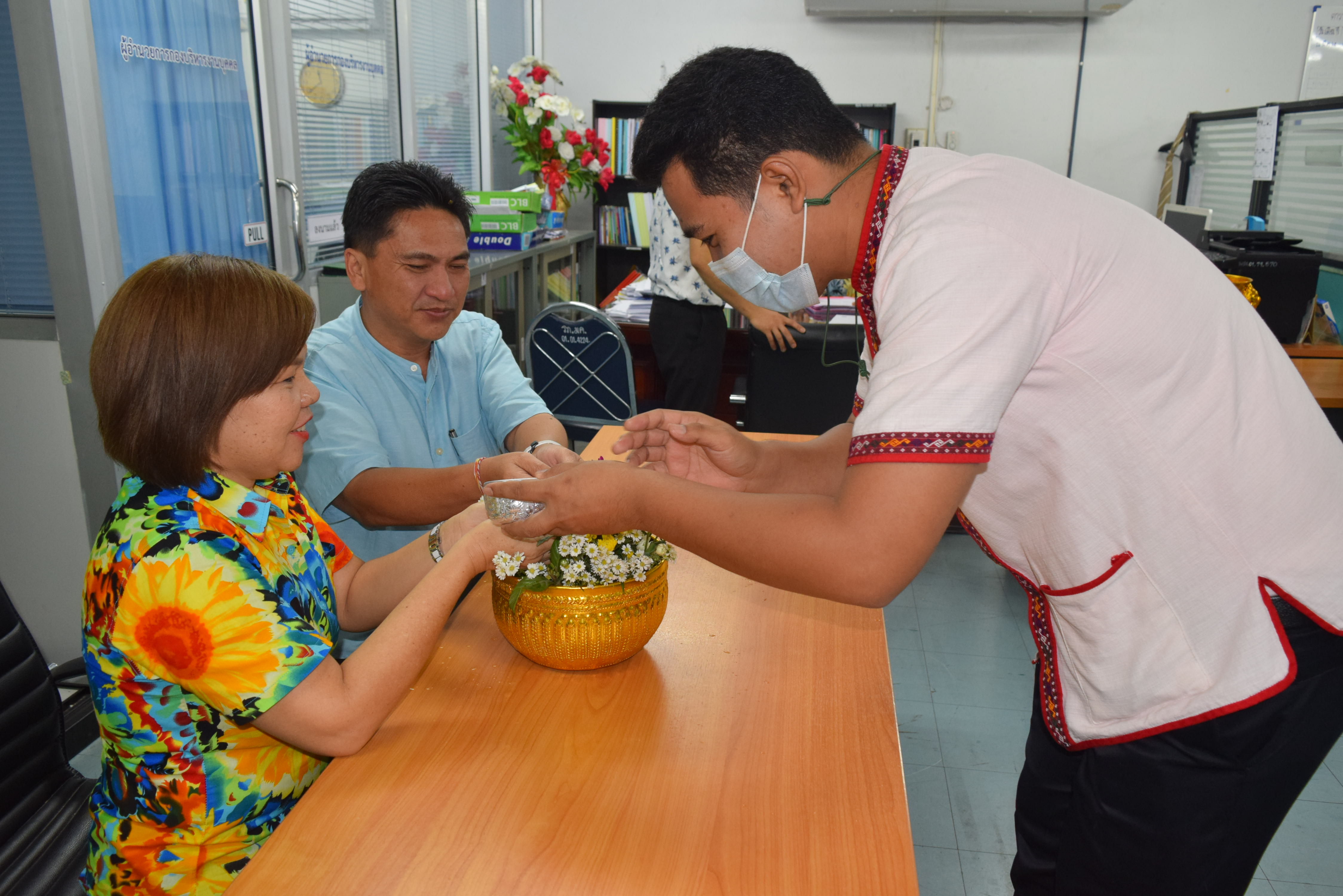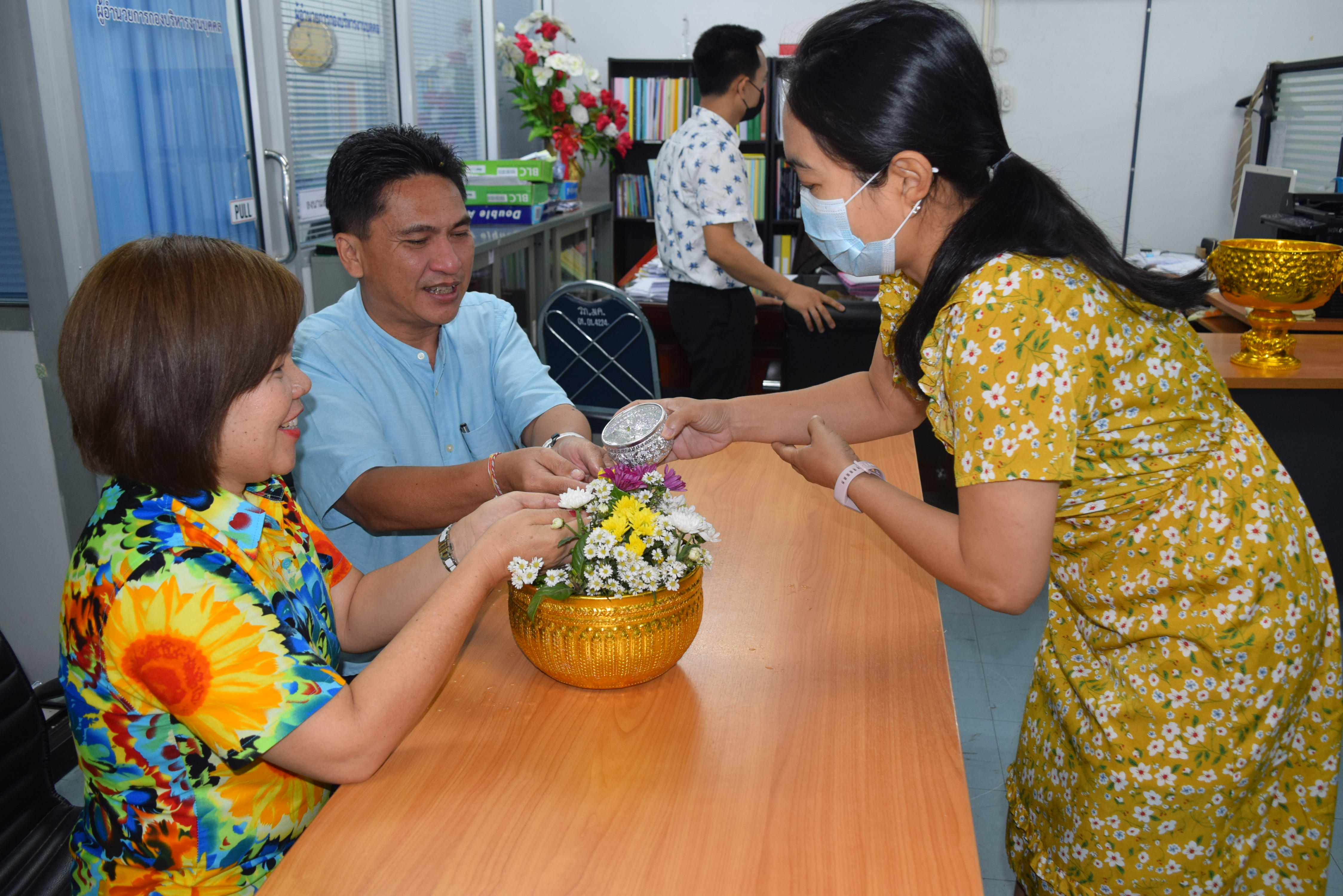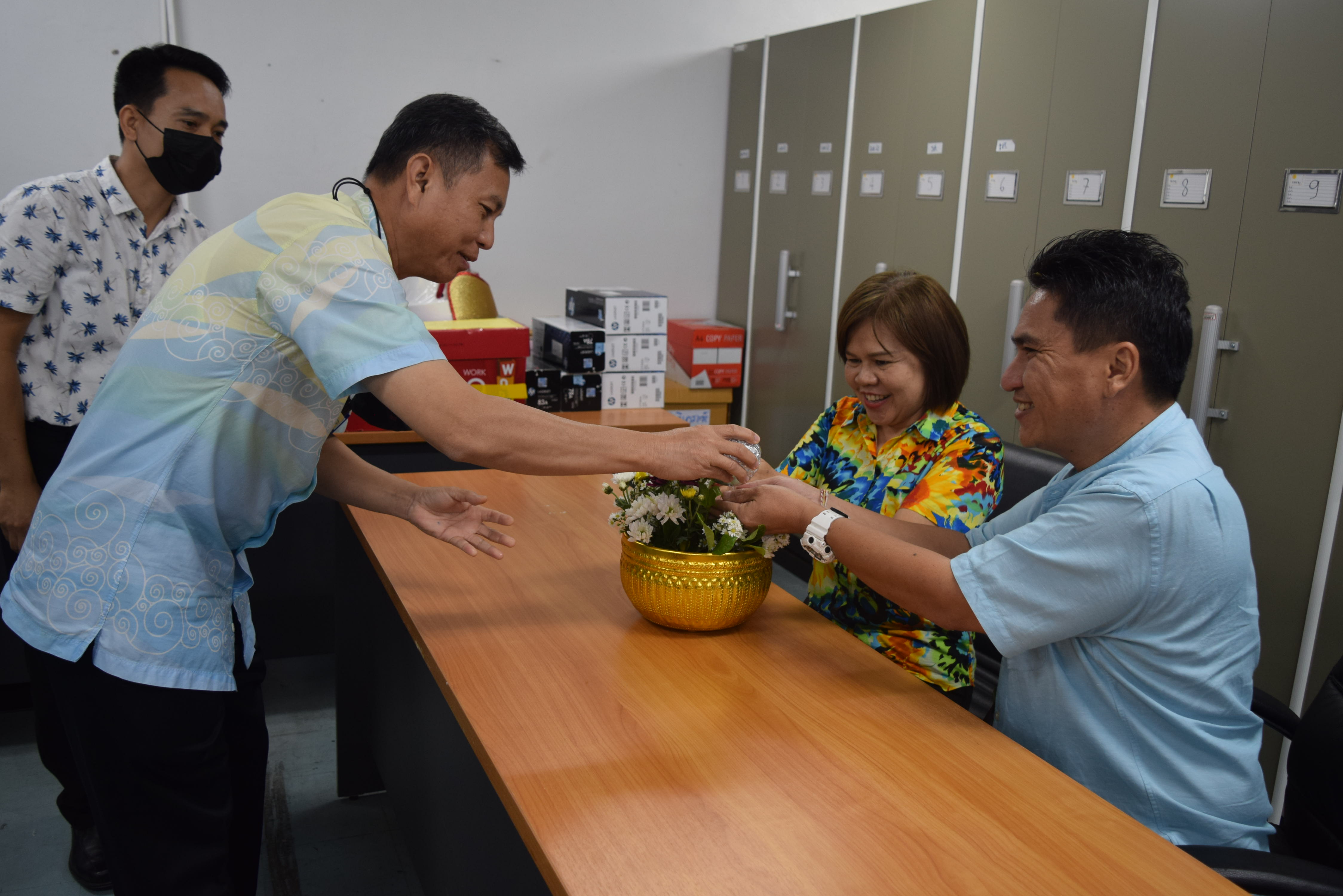 ผู้ช่วยศาสตราจารย์จักรกฤษณ์ จันทรศิริ รักษาราชการแทนผู้อำนวยการกองบริหารงานบุคคล มีข้อราชการที่จะหารือเกี่ยวกับการดำเนินงานของกองบริหารงานบุคคล พร้อมรับฟังความคิดเห็นจากบุคลากรทุกท่านและมอบนโยบายแนวทางการดำเนินงาน และจัดพิธีรดน้ำขอพร เนื่องในวันสงกรานต์ โดยมี นางลำดวน ดวงคมทา ผู้อำนวยการสำนักงานอธิการบดี มหาวิทยาลัยราชภัฏมหาสารคาม เป็นประธาน พร้อมบุคคลากรกองบริหารงานบุคคล มหาวิทยาลัยราชภัฏมหสารคาม เพื่อความเป็นสิริมงคล เพื่อให้เป็นการเริ่มต้นปีใหม่ไทยที่มีความสุข ณ ห้องประชุมกองบริหารงานบุคคล ชั้น 2 อาคารเฉลิมพระเกียรติ 72 พรรษา